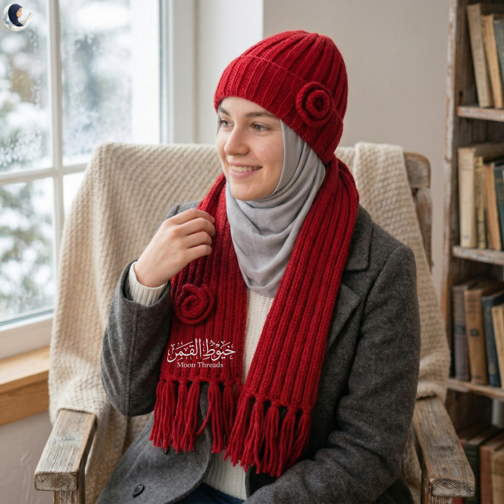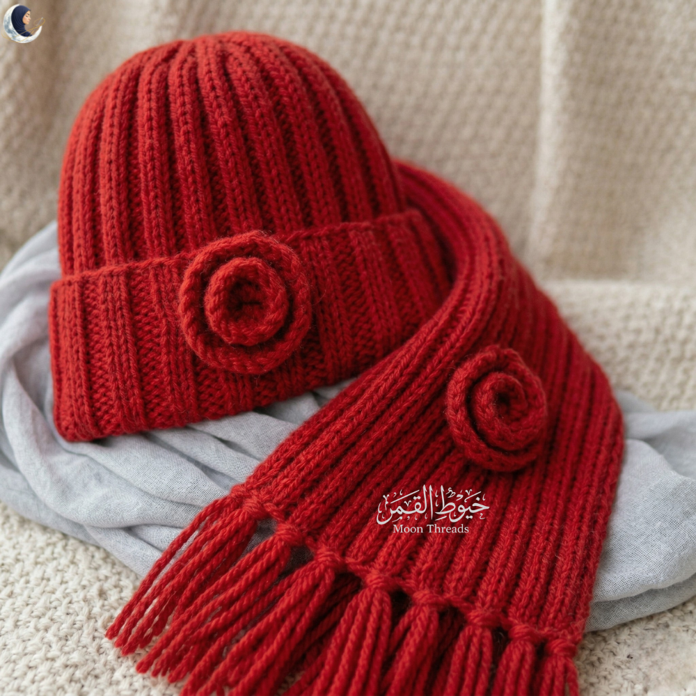 طقم كروشية شتوي (كوفيه + طاقية) مصنوع يدويًا بخامات دافئة وجودة عالية من خيوط القمر، تصميم أنيق يوفر الدفء والشياكة ومناسب للاستخدام اليومي أو كهدية.