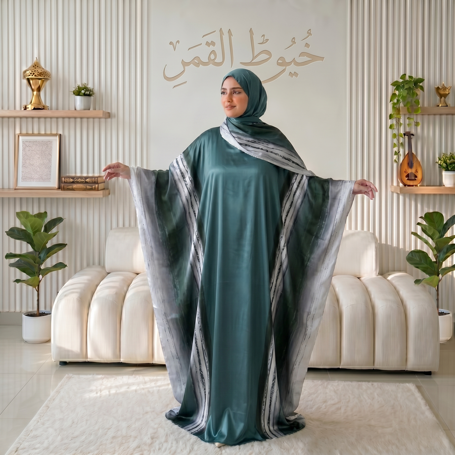 - التصميم: يتميز بلون أخضر جنزاري (Teal) راقي جداً، مع تداخل نقشة رخامية (Marble) بتدرجات الرمادي والأبيض على الأكمام وجوانب الاسدال.