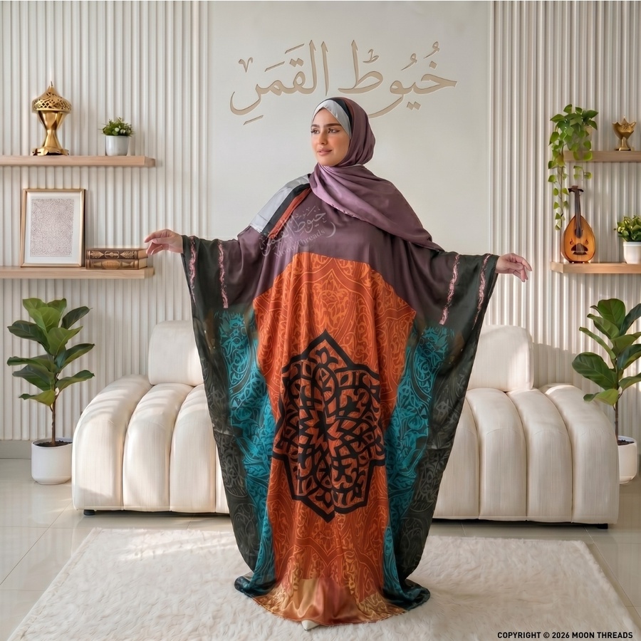تصميم استثنائي يجمع بين جرأة الألوان وفخامة النقوش الشرقية، ليمنحكِ حضوراً مميزاً وإطلالة مليئة بالحيوية.