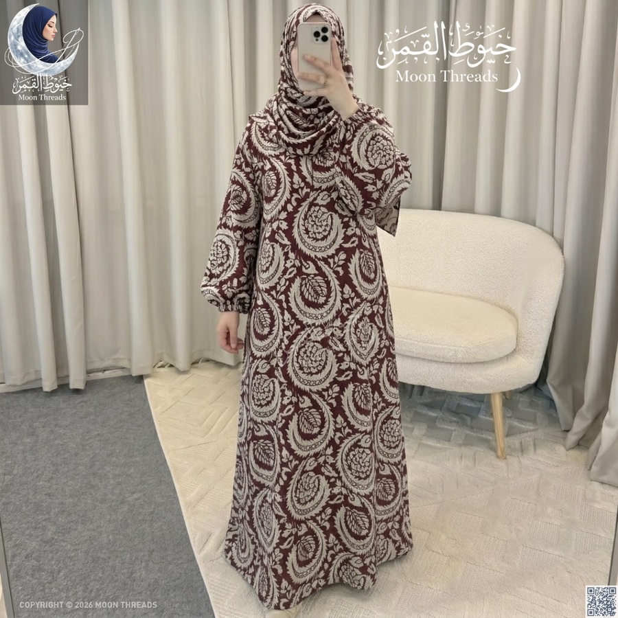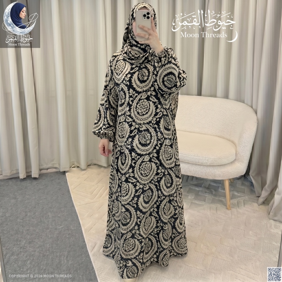إسدال نقوش كلاسيك بتصميم مستوحى من الزخارف الراقية، مصنوع من فسكوز مخلوط (قطن + بوليستر) معالج للحفاظ على ثبات المقاس وتقليل الانكماش بعد الغسيل.